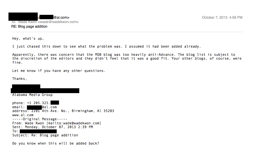 I asked by email for it to be reinstated, and the response from an al.com employee was that this site was “heavily anti-Advance” and that “the editors didn’t feel that it was a good fit.” (Advance Publications owns al.com.)